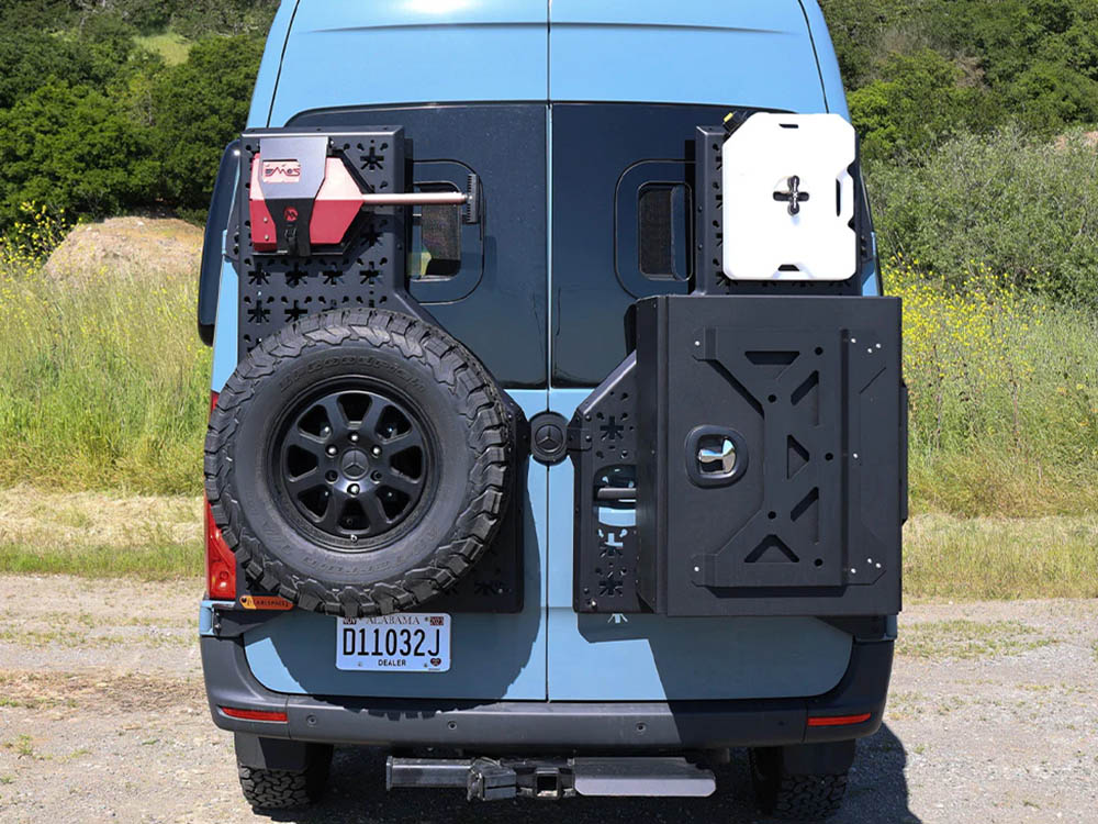 Called the nVader rack, the perforated metal panels mount to the back of 2019 and later Mercedes-Benz Sprinters, as well as Storyteller Overland’s Stealth, Mystic, and Beast Mode adventure vans. Available for $999 each, buyers can choose from driver or passenger side racks or both (seen below). Choose the set, and Flarespace will include a $299 tire bucket in the deal. The price does not include shipping, but if buyers are near a Flarespace dealer, the company is offering free installation for a limited time.