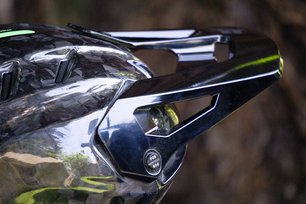 The helmet itself consists of an angular grey and black layered carbon fiber shell with a green chin screen that can be subbed out for a black screen that is included. The plastic motocross peak/visor is mounted as stock, with longer, tinted, and shorter options included that can be swapped by loosening three simple mounting points. The interior padding includes a hydration hose routing loop and hooks, and the cheek pads are the quick-release types with red pull loops to allow EMTs to carefully remove the helmet in an emergency. The helmet, while very light, feels, works, and looks like the high-quality kit we expect from a brand like Fox, who have been making helmets for professional racers for decades.