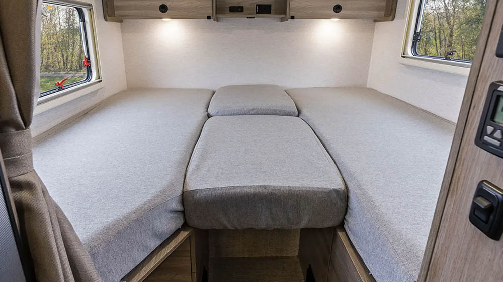 Go with the 2.0-liter turbodiesel “23B” Ekko Sprinter chassis, and the extra foot and half of space splits the shower from the toilet and re-arranges the kitchen. The Sprinter version also includes a single small slideout that expands the kitchen. In both versions, there’s heat (via a Truma VarioHeat unit) plus a super-quiet 13.5K BTU AC and a 2,000-Watt 120-Volt inverter in addition to the usual 12-Volt and USB power points.