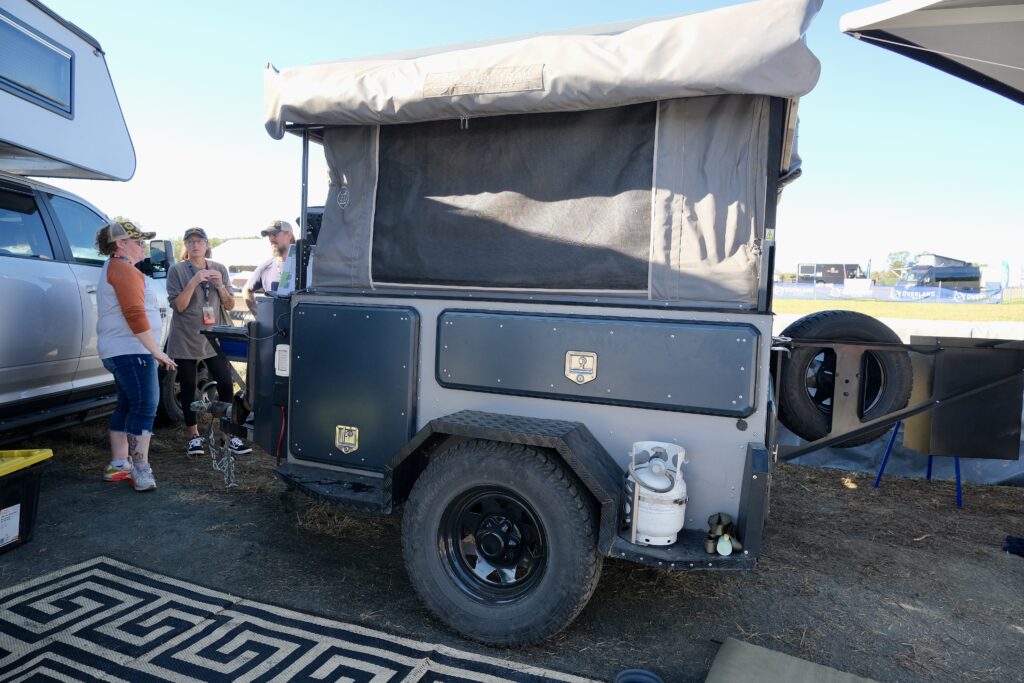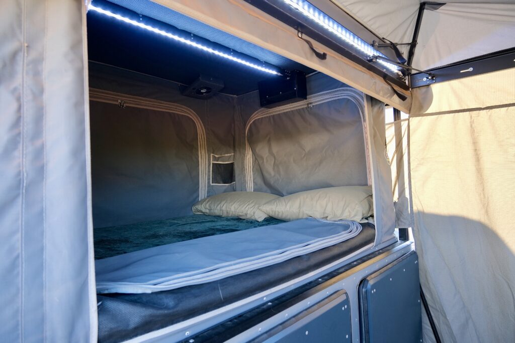 We were fortunate to get some time with the new BunduTrail offroad trailer at the Bundutech booth. The trailer is a low-profile pop-up style tent trailer weighing in at only 1,765 lbs. with a hitch weight of only 200 lbs. At 12′-5″ long, 6′-3″ wide, and only 5’3″ tall with the tent down, the trailer is a great fit for smaller vehicles or people who don’t want the hassle or extreme gas mileage hit of a larger trailer.