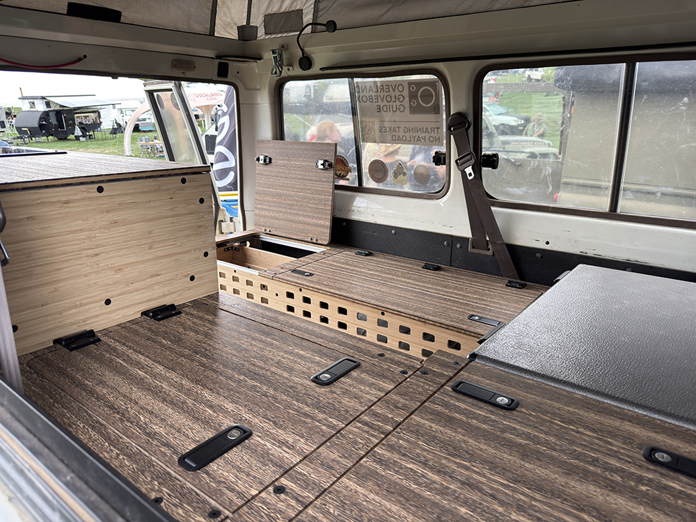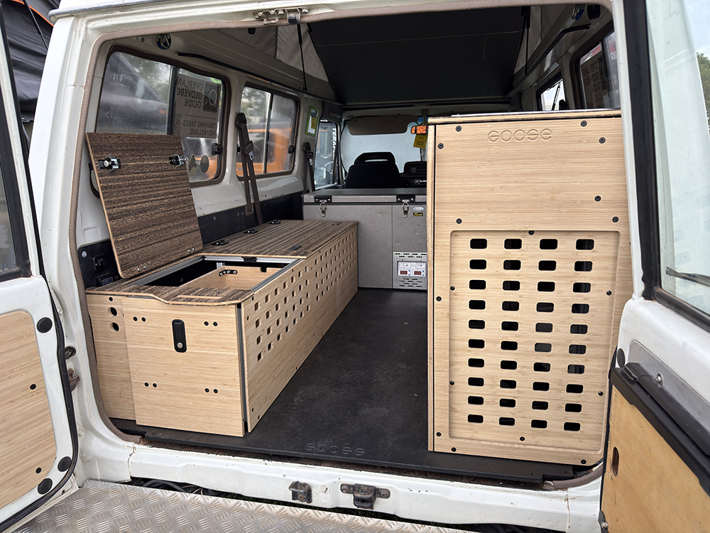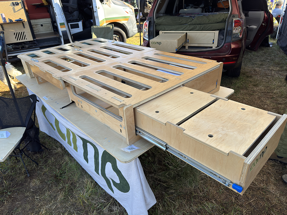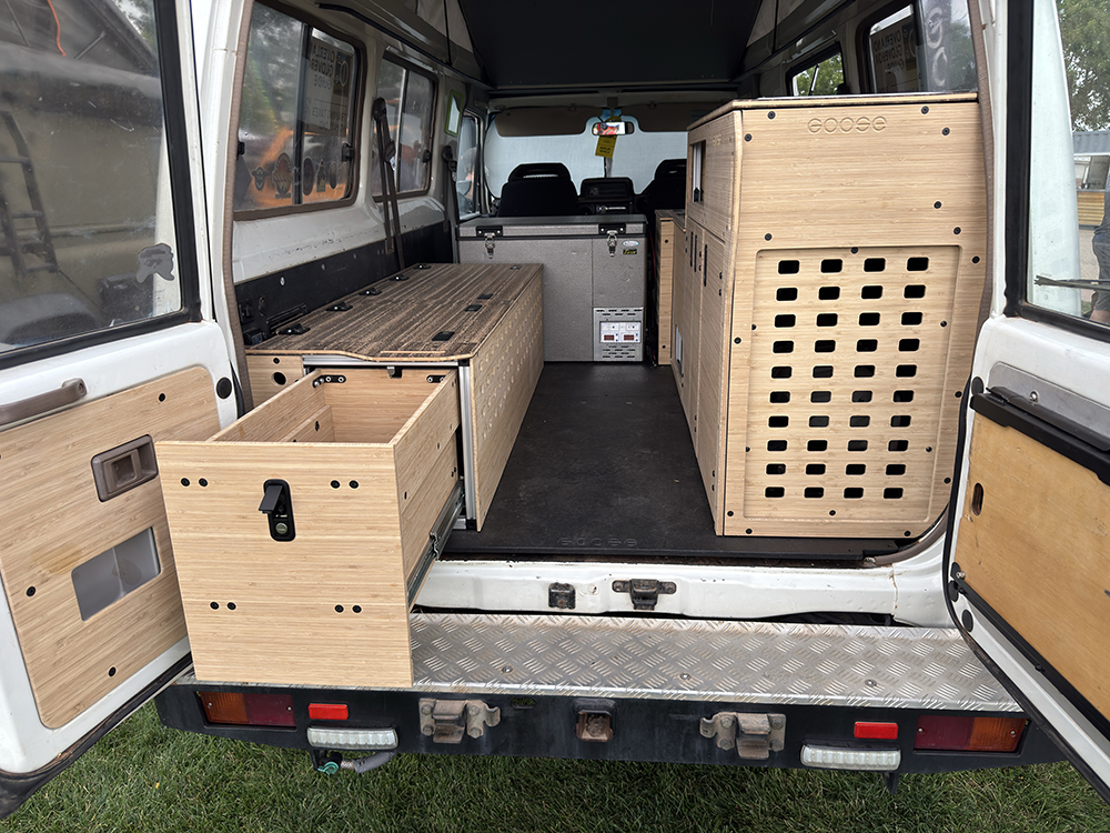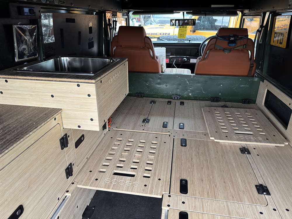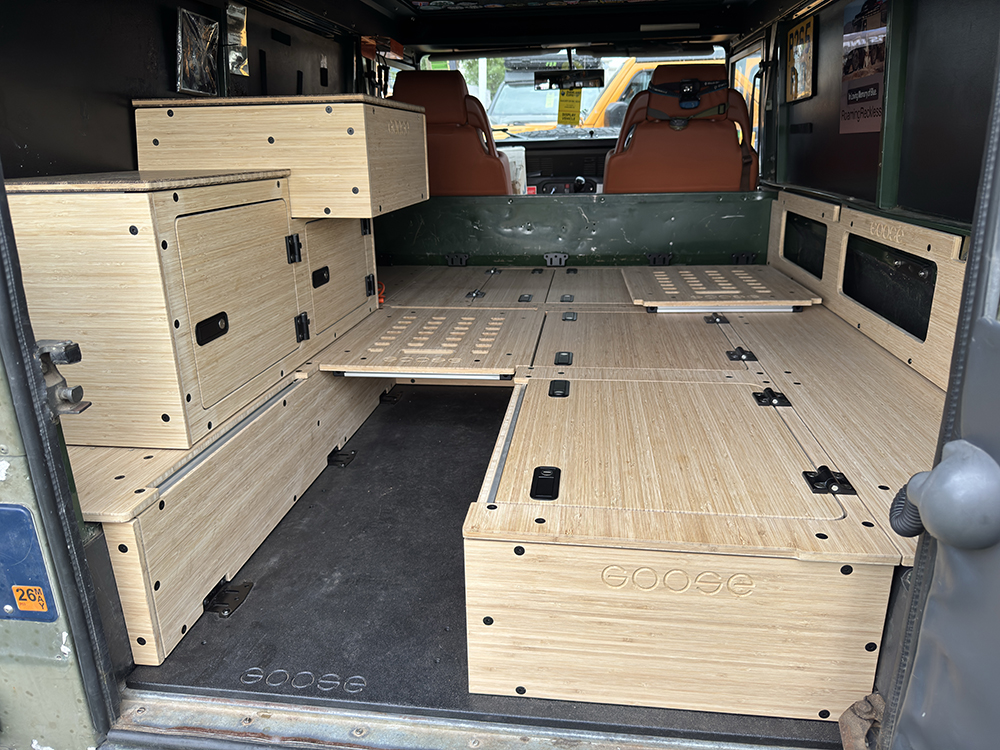 It’s a rare Overland Expo that we don’t find ourselves at the Goose Gear booth looking to see what the latest and greatest vehicle organization system is coming out of Grand Junction, Colorado. This year we got the chance to check out the latest changes to John Jacob’s Jeep Rubicon setup (which is a perennial favorite Jeep build) and we had the chance to talk a little more about their new Venture Series product line that is currently in the prototyping phase. The new line uses a bamboo plywood for the cabinet bodies and a bamboo and palm frond plywood for countertops and other horizontal surfaces. As usual, the Goose Gear setup maximizes storage with an array of drawers and access panels, but the new Venture series has integrated molle panels for a breadth of customization and flexibility. The Venture line is initially slated for the Ineos Grenadier, but prototypes have been spotted in both a Troopy and a Defender. Our hope is that we’ll see it offered on a broad range of vehicles as the new line rolls out.