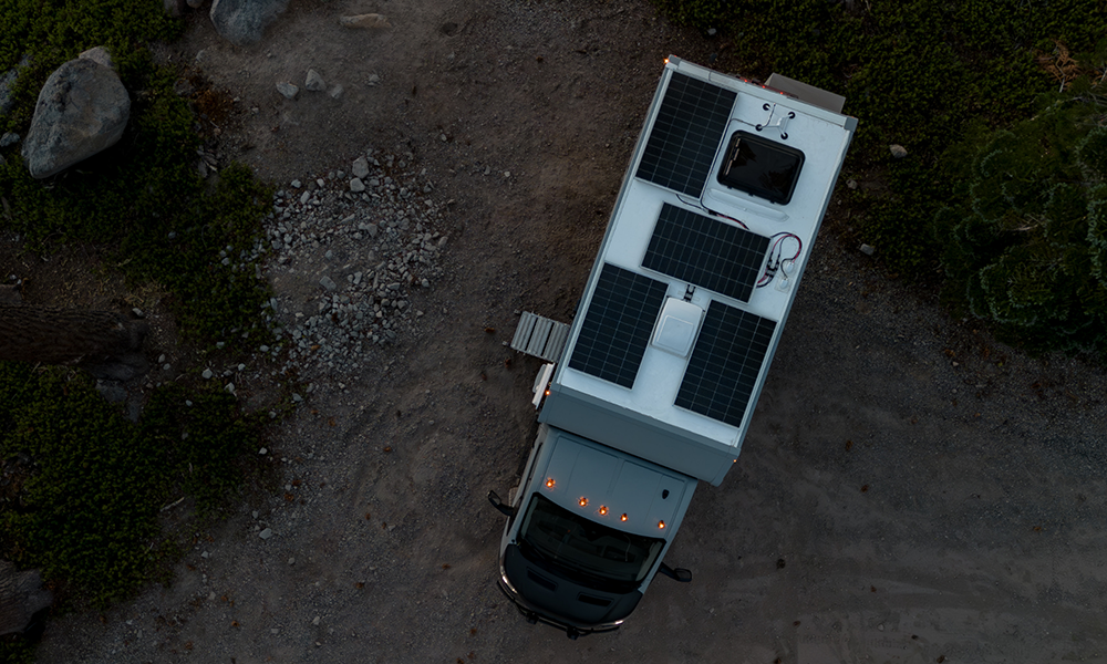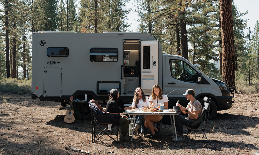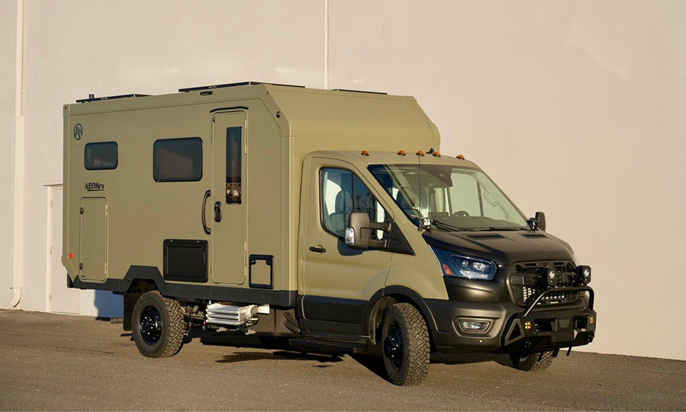 AEONrv is an all-season, electric cabin adventure RV built for off-road travel and extended off-grid stays. It uses modern and green technology, higher quality materials, and a fully insulated composite cabin engineered for true four-season capability. The composite structure, constructed using fiberglass reinforced panels, provides strength, thermal efficiency, and durability in extreme environments. The fully electric cabin removes the need for propane or generators, creating a cleaner and quieter camping experience. An 800-watt solar array paired with a robust lithium battery system allows travelers to stay out longer without hookups while maintaining modern comforts.