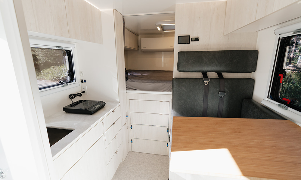 Inside, the Revel transforms compact space into intelligent living. The flexible Power Lift bed system rises effortlessly to reveal a spacious gear garage below, allowing owners to transport bikes, boards, and oversized equipment while preserving comfort. The streamlined galley features a compressor-driven refrigerator, induction cooktop, and stainless-steel sink, delivering practical utility for life on the move. A multifunctional wet bath and gear closet maximize efficiency, while integrated storage solutions ensure every inch serves a purpose. Designed for two occupants, the Revel’s interior prioritizes usability, clean design, and durability—qualities that resonate with travelers seeking both simplicity and comfort.