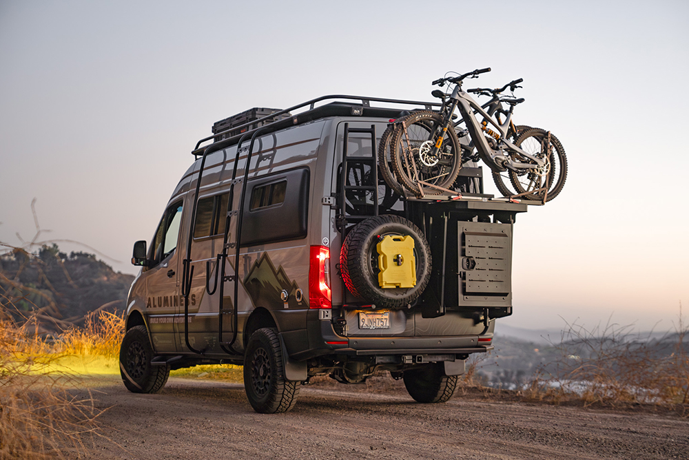 Built specifically for adventure vans such as the Mercedes-Benz Sprinter (2025+) and Ford Transit, the PowerLift integrates with Aluminess’ rear rack systems for a complete transport solution. Its battery-assisted lift mechanism raises and lowers bikes with smooth, controlled motion, taking the physical strain out of the task while minimizing the risk of damage to equipment or vehicle.