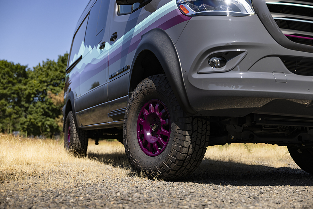 This is a purpose-built RV, not a van conversion. Built on a Ford Transit AWD 1-ton chassis with a 3.5L EcoBoost engine and 10-speed transmission, AEONrv combines factory intelligent all-wheel drive with a Van Compass 2-inch lift, upgraded suspension, and BFGoodrich KO3 all-terrain tires. The result is a compact 22-foot platform that remains maneuverable while capable of serious backcountry travel. The 24-volt electrical system includes a 10.9kWh lithium battery bank, upgradeable to 13.6kWh, a 3,000VA Victron inverter system, alternator charging, and integrated solar.