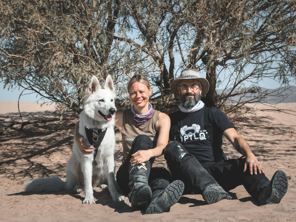 I ride a custom-painted purple 2023 Triumph Tiger 900 Rally Pro. On the back, I have Whimsy’s K9 Moto Cockpit mounted so that she can ride the world with me! Greg also rides an identical Tiger 900 Rally Pro, but without the snazzy color or Cockpit on the back. He carries the camping equipment.