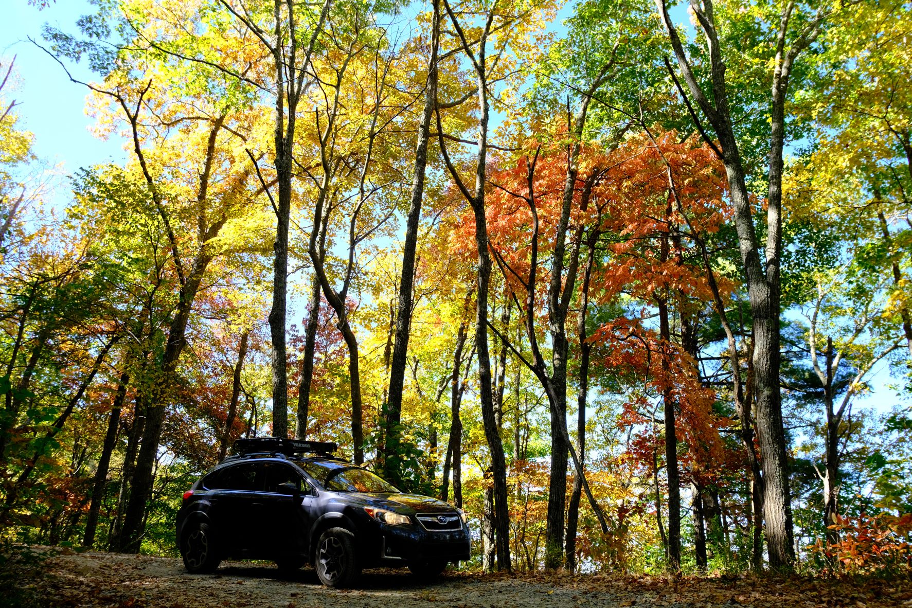 Along Hurricane Gap’s winding curves, we spotted a few trees showing off amongst their green neighbors. We usually adventure in a modified truck, so we had to remember to watch for potholes and washouts. Our Subaru is plenty capable, but it’s also mostly stock. We didn’t want to take a chance on bottoming out or popping a tire. This wasn’t the kind of trip where we were looking to venture into type 2 fun.