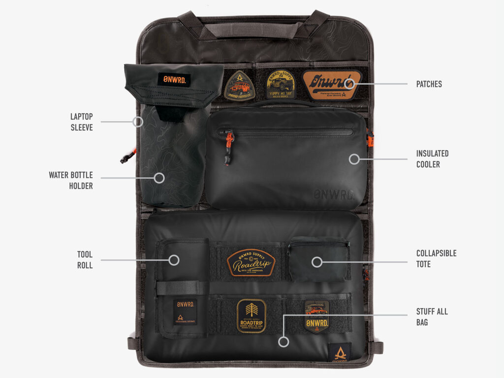 The ØN2 Vehicle Organizer is ØNWRD’s flagship seat-back storage solution, built to handle everything from daily errands to off-road expeditions. Its fully configurable MAP System features six rows of Velcro loop—top bound and bar tacked at every intersection—offering endless customization. A discreet zippered “Smuggler” pocket on the back panel provides hidden storage for a laptop or maps, while a built-in carry handle makes it easy to move from garage to rig. The ON2 mounts securely to most vehicle bucket seats using an upper quick-release clasp and adjustable lower straps for a stable, no-sag fit. Pre-configured to accommodate accessories like the Stuff All Bag, Tool Roll, and Insulated Cooler, the ON2 delivers a compact, modular solution that adapts to any journey.