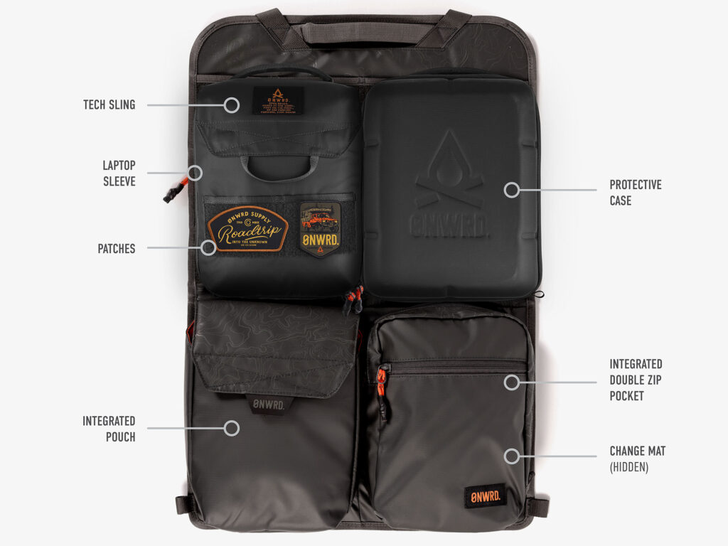 For those needing more capacity, the ØN3 Vehicle Organizer expands storage and versatility. It features three rows of Velcro loop for modular attachments and two large organizer pockets at the base—one with a cargo flap and another with a zippered closure and front stash pocket. Like the ON2, it includes a “Smuggler” pocket for concealed laptop storage and a carry handle for easy transport. The ON3 attaches securely to most bucket seats and includes reinforced Hypalon corner tabs with metal grommets for semi-permanent mounting. Pre-configured with gear like the Protective Case, Changing Mat, and Tech Sling, the ON3 keeps larger loads organized and accessible.