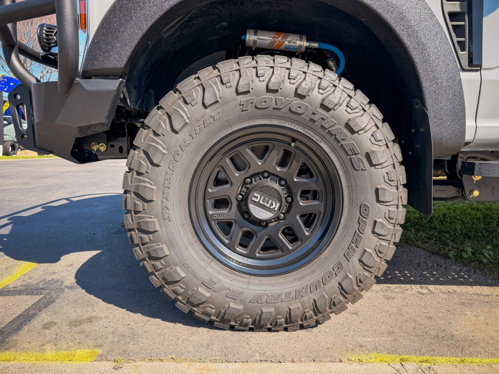 Designed with utility in mind, the flatbed features lower storage boxes, a rear underbed drawer, a massive 28-inch forward garage, and integrated bedside tie-downs, along with Rigid Industries rear lighting. It rides on KMC wheels wrapped in Toyo Tires Open Country R/T Pro, striking a balance between durability and all-terrain performance. Supporting the added weight, Carli Suspension XXHD rear leaf springs help keep everything planted and composed.