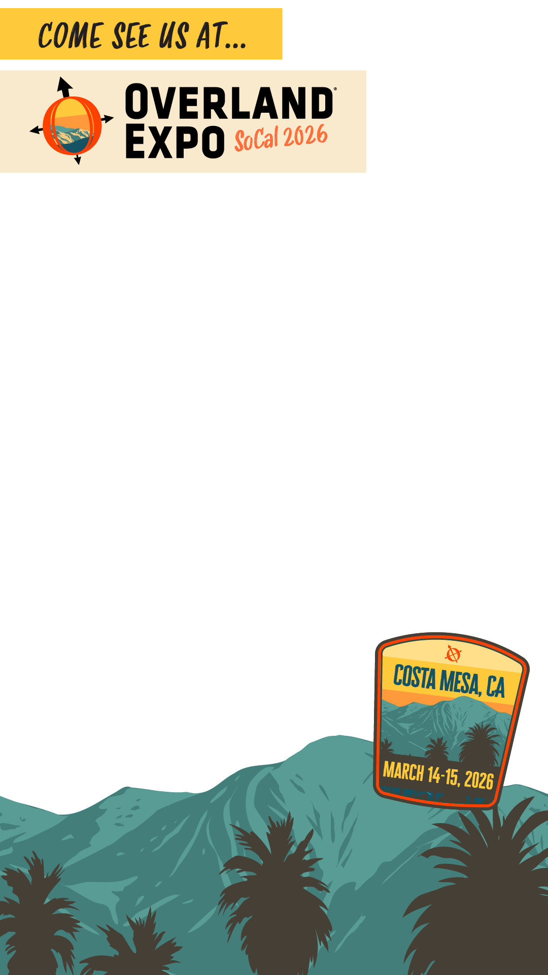 Share with your fans and followers that you’ll be exhibiting at Overland Expo SoCal in March! Below are frames to overlay on a photo of your own.